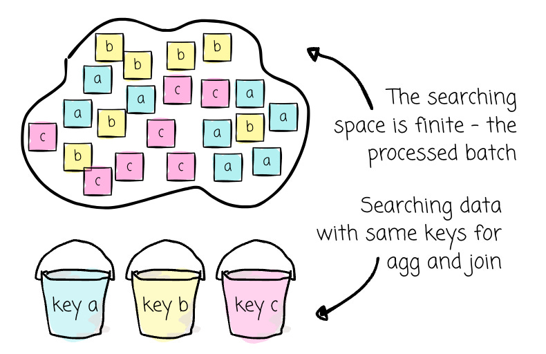 Essentially, aggregation and joining are searching for records with the same key. With batch processing, the system knows beforehand the scope of the searching process. This is sound obvious, but when it comes to stream processing (the system doesn’t see the scope for search), you will understand clearly this advantage of batch processing.
