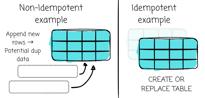 We can control this by using an idempotent operation to materialize the data. `CREATE OR REPLACE TABLE` and dbt’s insert overwrite strategy are examples.