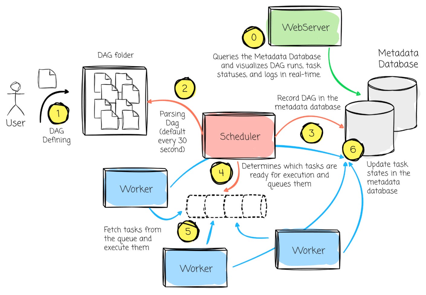 Monitoring: The Web Server queries the Metadata Database and visualizes DAG runs, task statuses, and logs in real-time. Users can monitor task progress, inspect logs, or trigger manual DAG runs from the UI.