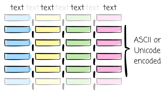 Text-based formats rely on character encoding to serve as a dictionary between binary numbers and the characters displayed on the screen.