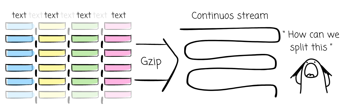 However, if we use a non-splittable compression algorithm, such as Gzip, the entire file becomes a single, continuous compressed stream. A processing engine can’t divide the work.