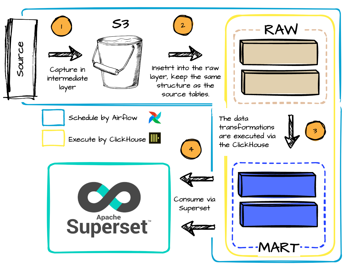 The data transformations are carried out via the Clickhouse engine with the help of the Airflow scheduler.