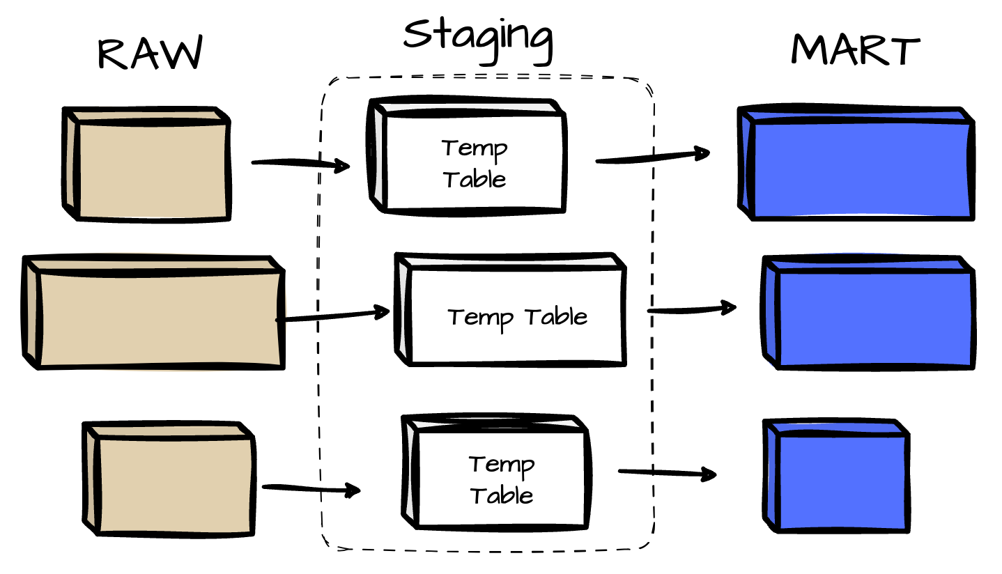 Many temporary tables are created between the raw and mart tables during the transformation. Transformed data is first written to a staging table before being inserted into the target table. This provides flexibility by allowing the reuse of these staging tables. Each staging table has a unique name for every Airflow DAG run.