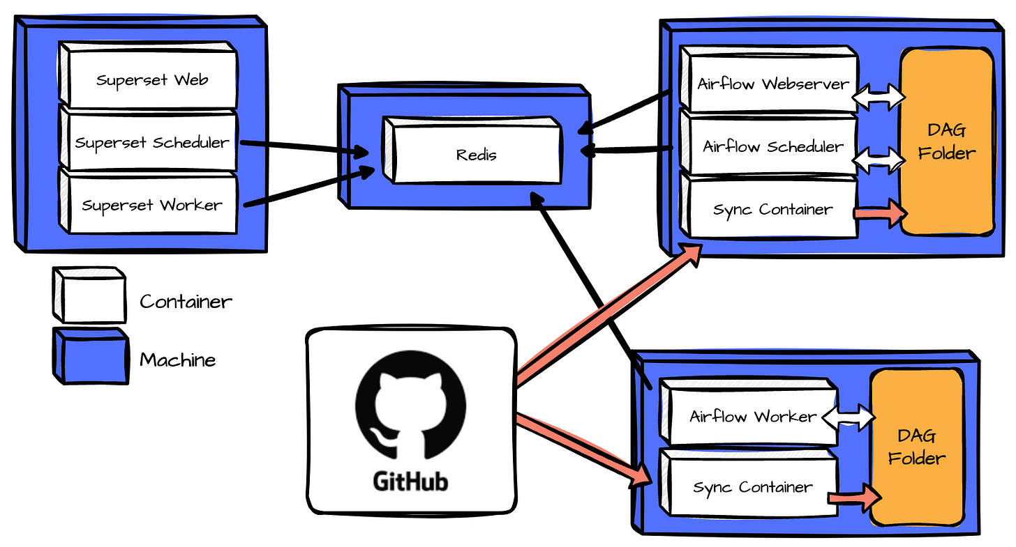 Airflow and Superset share a Redis instance on a separate machine. Redis handles execution states for Airflow and cached query results for Superset.