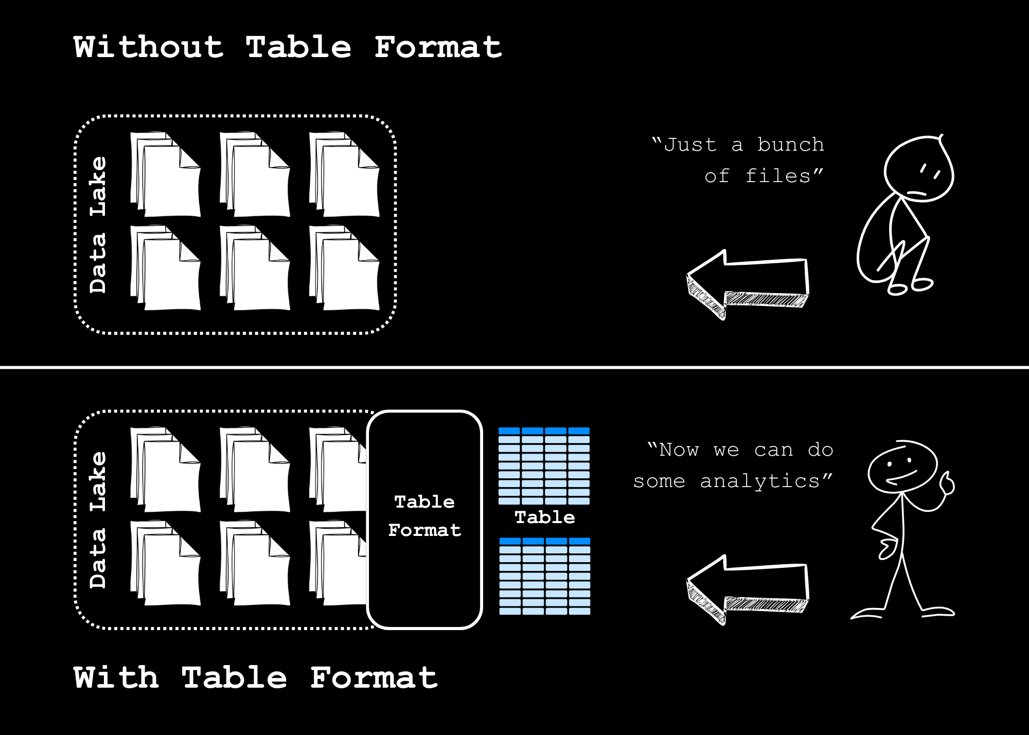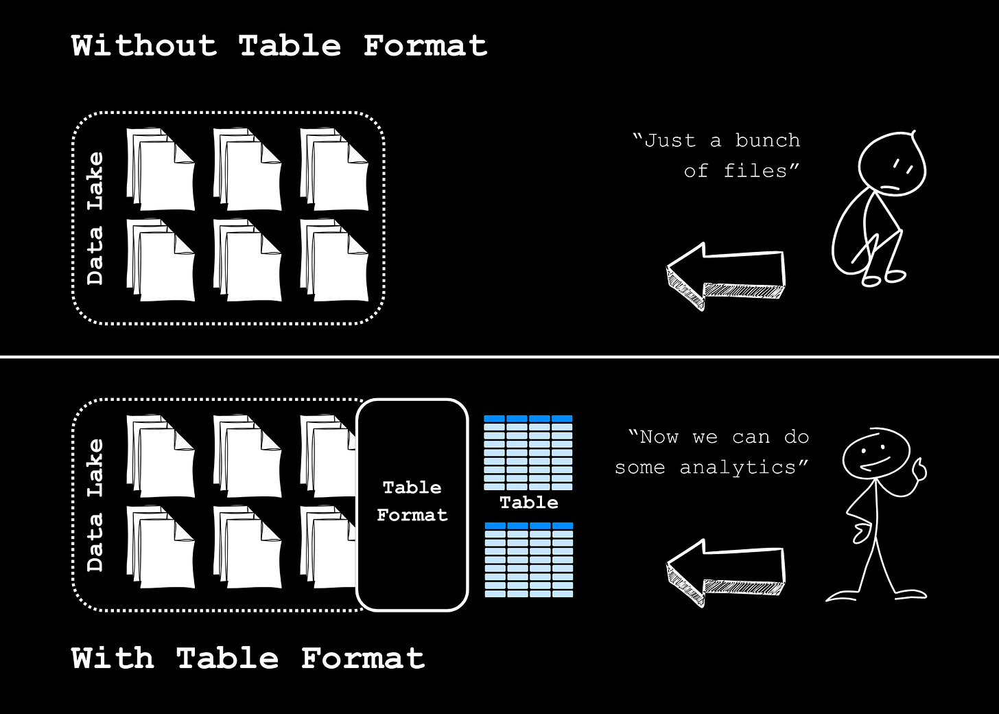 We will answer this by asking another question: What is the table format? If you work with the database or the data warehouse, they give you a lovely abstraction: the table. The system hides away the actual physical data layer under the hood, so you don’t need to worry too much about the data beneath.