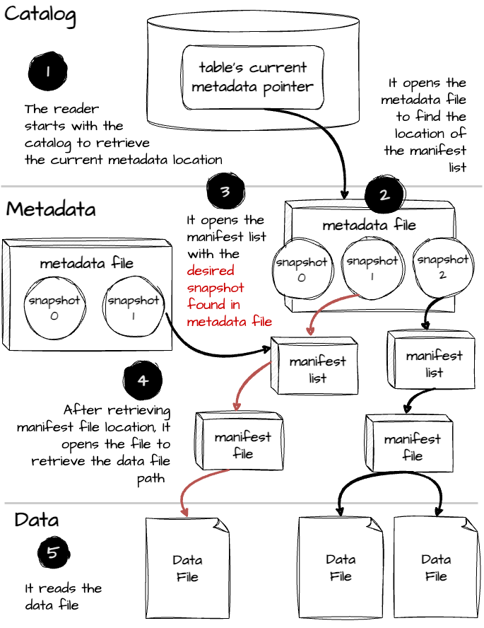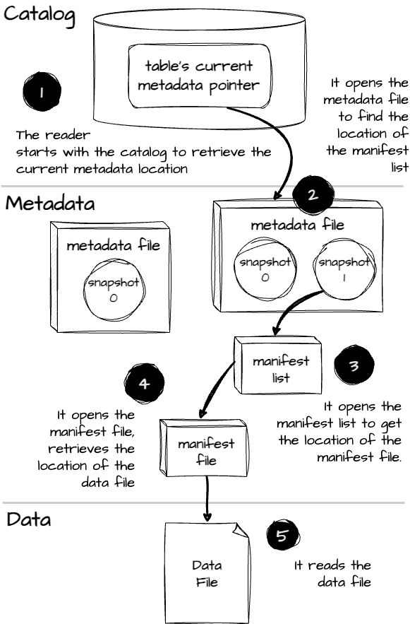 The engine starts by reading the to retrieve the location of the table’s current metadata file.
