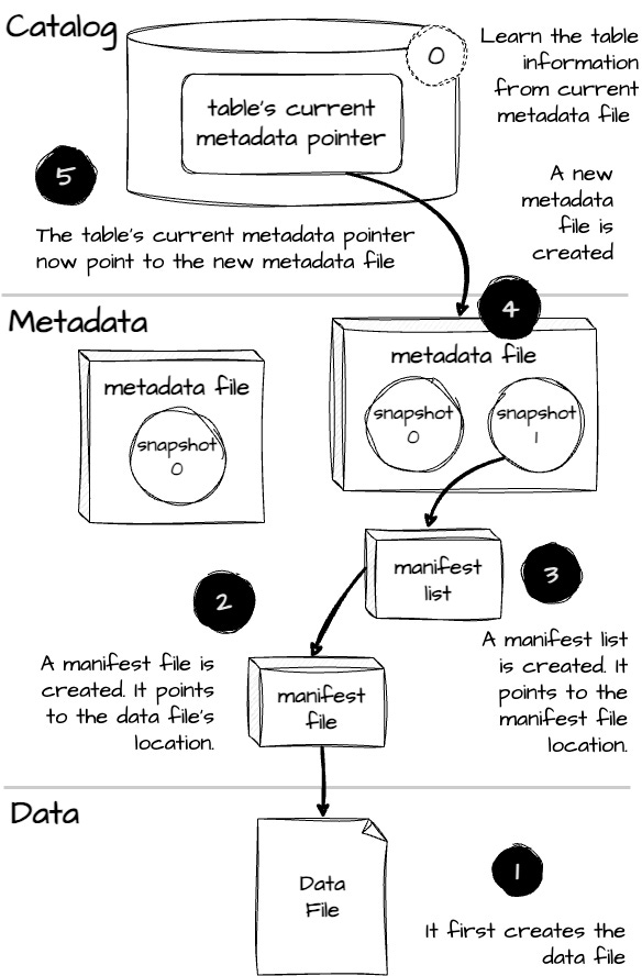 At the final stage, the engine will update The catalog record for this table's current metadata pointer to point to this metadata file’s location.