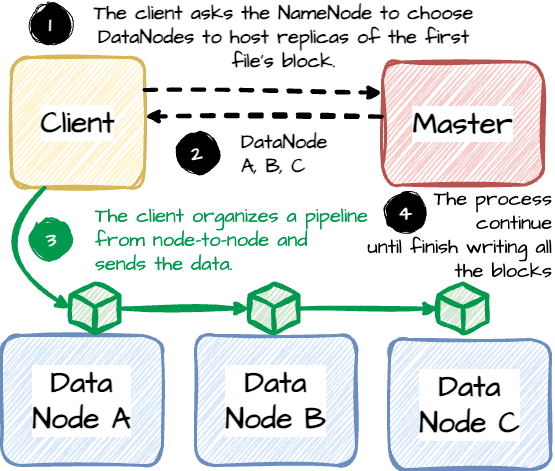 With the write operations, the client first asks the NameNode to assign DataNodes to host replicas of the first file’s block. After getting the DataNode lists, the client organizes a data pipeline from node to node and sends the data. When the first block is finished written, the client asks the next DataNodes from the list to handle the next block’s replicas.