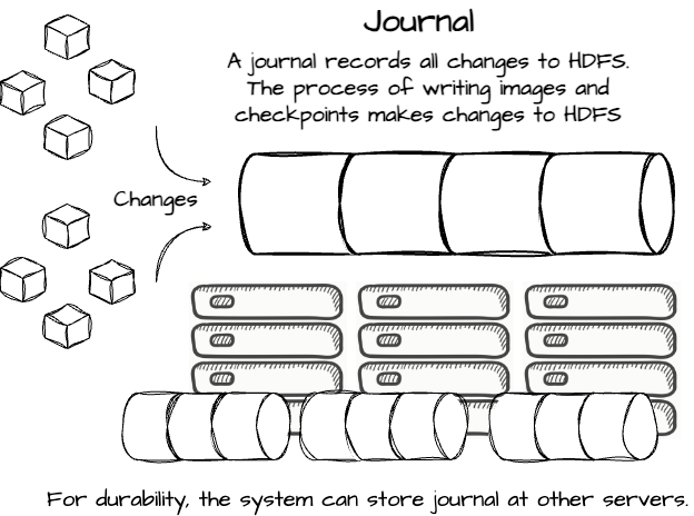 The NameNode also stores the image’s modification log, called the journal, in the local file system. To improve the durability of the operations, HDFS replicates multiple copies of checkpoints and journals at other servers. On the other hand, HDFS does not persist in the block replicas’ locations because this information changes over time.