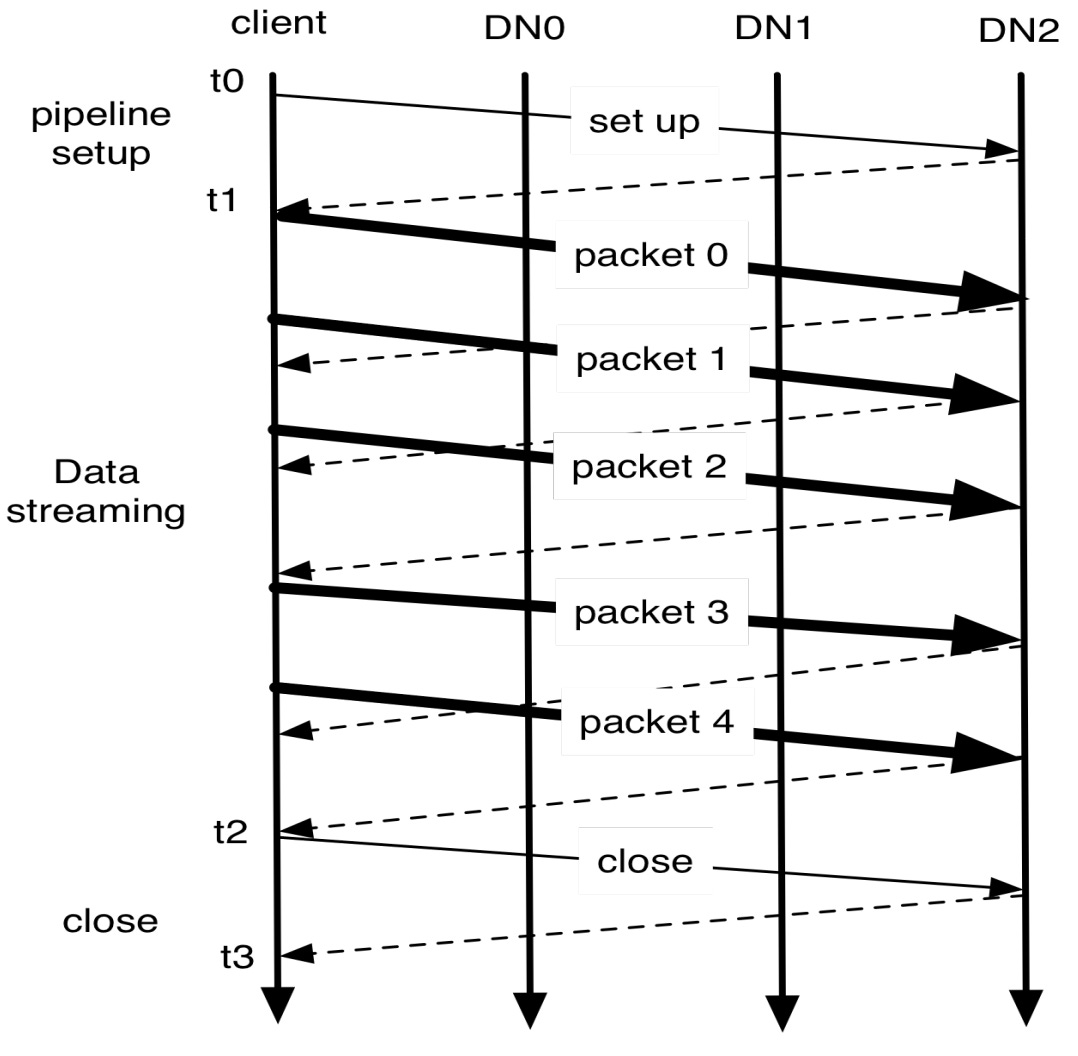 An HDFS file consists of blocks. If a new block is required, the NameNode allocates a block with a unique block ID and determines a list of DataNodes to host the block’s replicas. The DataNodes form a pipeline to minimize the total network distance from the client to the last DataNode. Bytes are pushed to the pipeline as a sequence of packets. The bytes that an application writes first buffer at the client side. The data are pushed to the pipeline after filling a packet buffer (typically 64 KB). The next packet can be moved to the pipeline before receiving the acknowledgment for the previous packets. After writing, HDFS only guarantees the data is visible to a new reader when the file is closed.