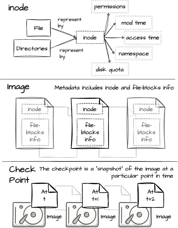 HDFS keeps the entire namespace in RAM. The inode data and the blocks to each file mapping that have the metadata are called the image. HDFS persists the image’s record in the local file system, called checkpoint.