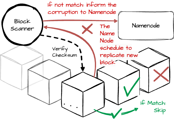 The DataNode periodically runs the block scanner to check if the block data matches the stored checksums. The system stores each block’s verified time in a human-readable log. When a read client or a block scanner detects block corruption, it informs the NameNode. The NameNode marks the replica as corrupt but does not delete the replica right away; instead, it executes the block replication from a valid block. Only when the valid replica count reaches the desired number of replications does the NameNode schedule for deletion of the corrupt replica.