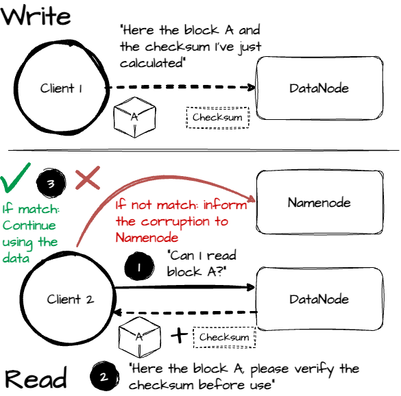 To prevent reading corrupt data, the HDFS can verify the checksums while reading to help detect any corruption. HDFS generates and stores checksums for each data block of an HDFS file. When creating an HDFS file, the client computes the checksum sequence for each block and sends it to a DataNode with the data. A DataNode stores checksums in a separate metadata. DataNode sends the block’s data and checksums to the client during the read process. The client then verifies that the newly computed checksums match the ones received. If not, the client informs the NameNode of the corruption and continues the process on a different block’s replica in another DataNode.