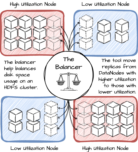The tool will move replicas from DataNodes with higher utilization to those with lower utilization. When choosing a replica to move and its destination, the balancer guarantees that the decision does not reduce the number of replicas or racks. The balancer minimizes rack-to-rack data copying. Suppose the balancer moves replica A to a different rack, and the destination rack has a replica B of the same block. In that case, the balancer will copy data from replica B instead of A.