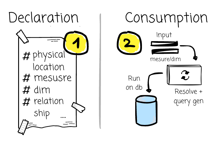 Consumption: Users navigate and select the desired metrics and dimensions exposed by the semantic layer (with more user-friendly names). The input is then converted into an SQL query that leverages the information from the Declaration stage.