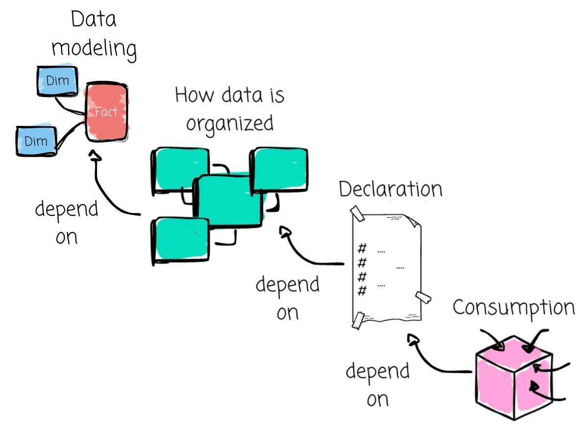The performance and usability of the consumption stage depend on the declaration stage. The declaration stage, in turn, depends on how your company stores and organizes data. And data modeling controls those processes. If you don’t have data modeling at all, your semantic layer will also be a mess.
