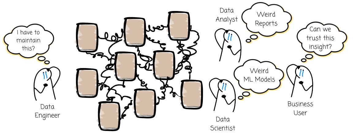 You can go case by case at first. For example, a user A needs this kind of table, so you build a pipeline for it. Then user B needs another table, so you build another pipeline for it. Things work. However, as the use case expands, the number of sources increases, and the way data is served changes, we will have trouble.