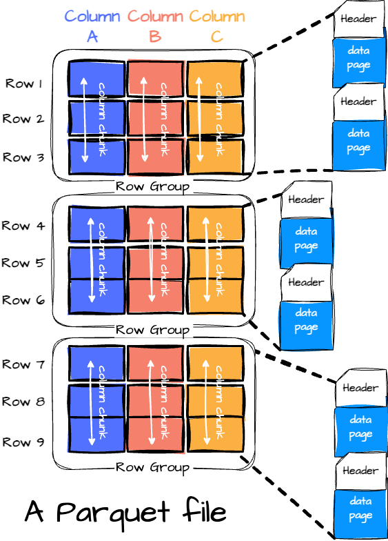 Row Groups: Each row group contains a subset of the rows in the dataset. Data is organized into columns within each row group, each stored in a column chunk.