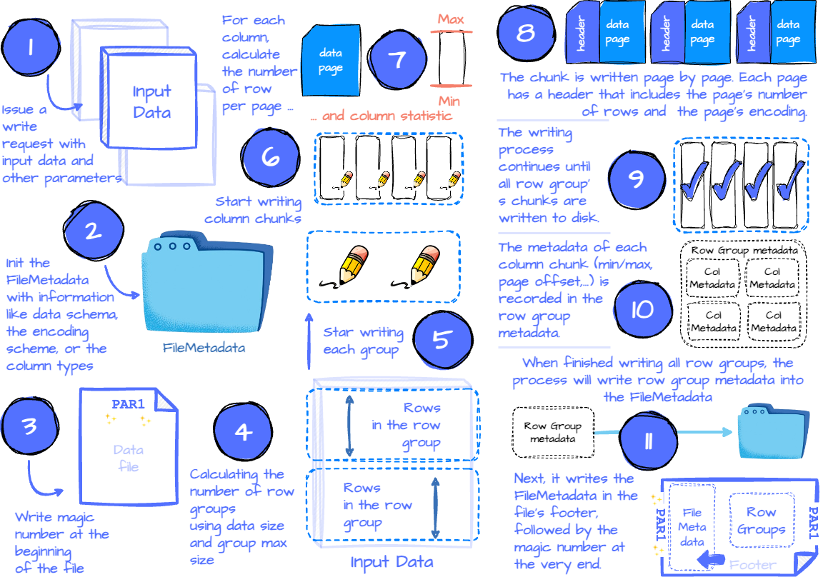 The application issues a written request with parameters like the data, the compression scheme for each column (optional), the encoding scheme for each column (optional), the file scheme (write to one file or multiple files), custom metadata, etc.