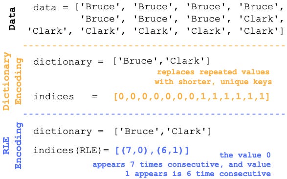 RLE, on the other hand, compresses consecutive identical values by storing the value once along with its repetition count. These methods minimize the amount of data stored and optimize read performance by reducing the amount of data that needs to be scanned.