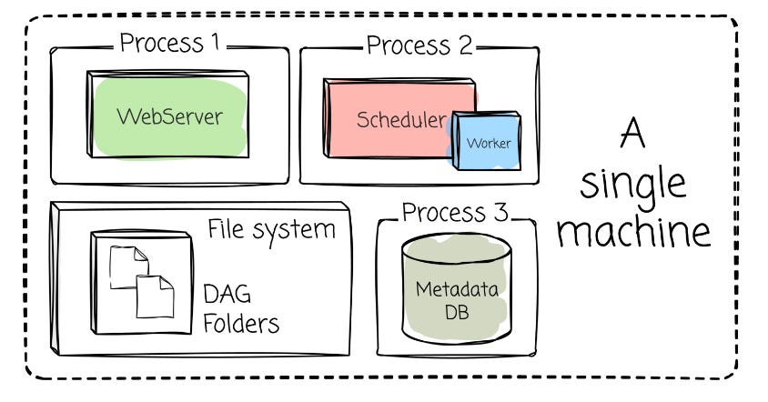 Another way to deploy Airflow on a single machine is by separting each process into a separate container (via Docker or on a local Kubernetes cluster such as Minikube)