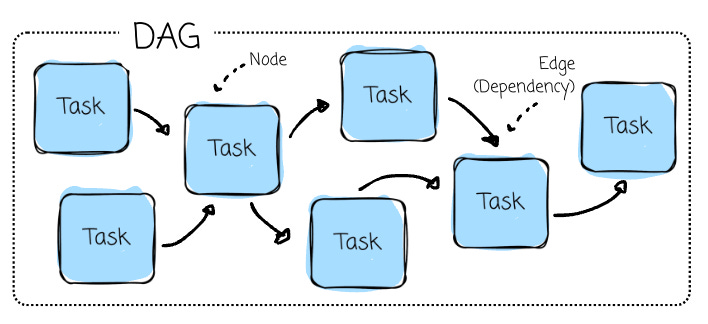 Dependencies (Edges): The relationships between tasks that define their execution order (e.g., preprocessing is executed only after retrieving data from a third-party API).