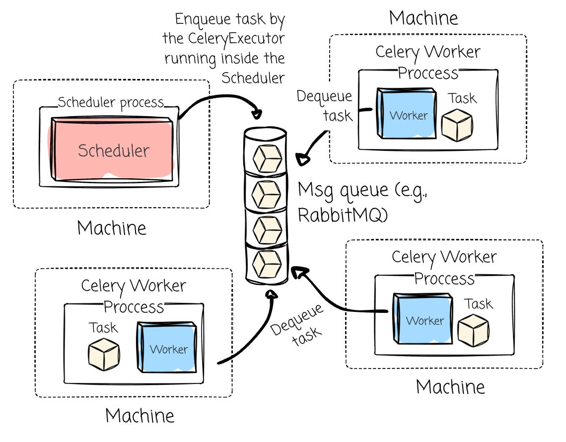 The CeleryExecutor allows us to enter distributed systems and horizontal scaling. It relies on Celery, a robust distributed task queue. Compared to the two above executors, the workers who run the task are separate from the scheduler machines.