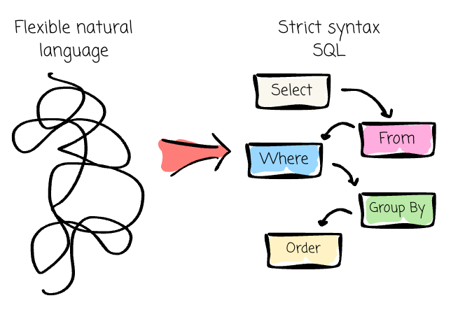 Natural language is flexible, whereas SQL queries must adhere to a strict syntax. Even SQL queries could have different syntax depending on the standard and the database implementation.