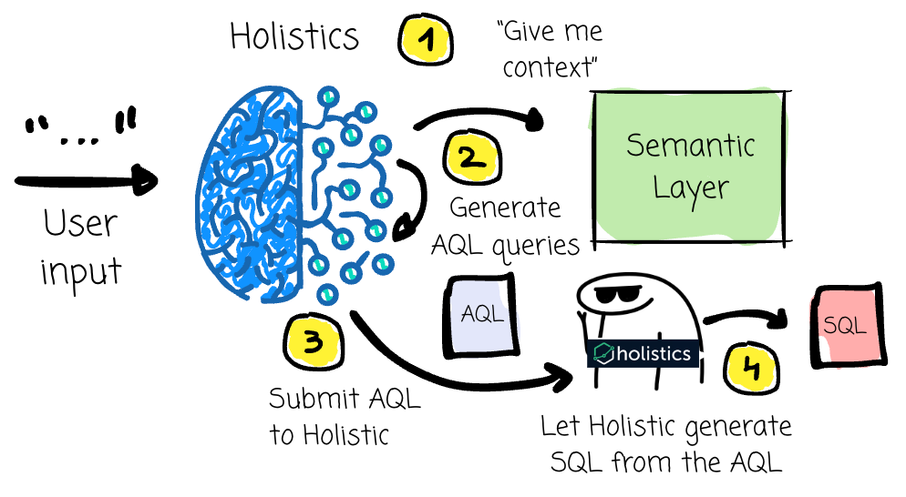 Back to Holistics, the way they build the text-to-SQL will look like this: they trained their AI models to accept natural language input and output the AQL queries with the help of the semantic layer. The AQL query is then converted to a SQL query.
