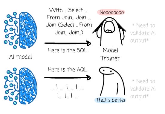 The high level abstraction AQL provides reduces risks of errors and hallucination as compared to the risk of AI errors from interpreting and using low level SQL queries from scratch.