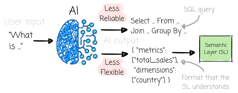 So, letting the AI model generate the SQL directly is less reliable, but interacting via the semantic layer with the intermediate format is less flexible. What do we do?