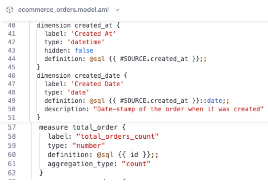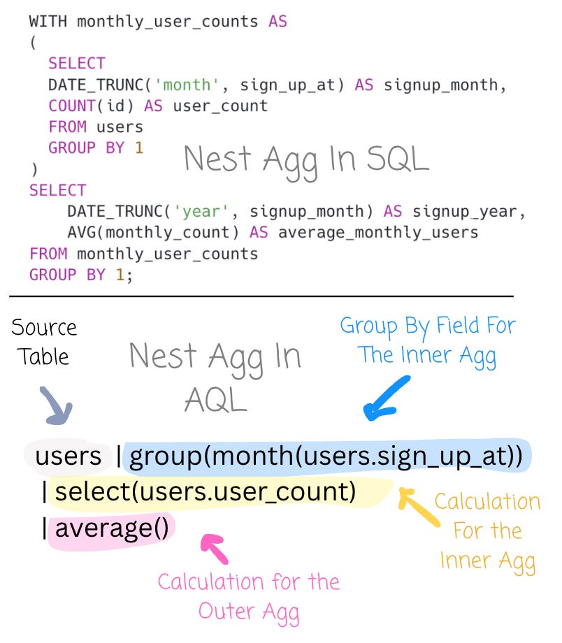 AQL treats metrics as first-class citizens, making metric definition composable and reusable. This differs from SQL, where everything is a query. If you want to reuse a piece of metrics, you must save the query that calculates it somewhere, such as in a CTE, a view, or a table. When adjusting the metric logic, you must modify the query.