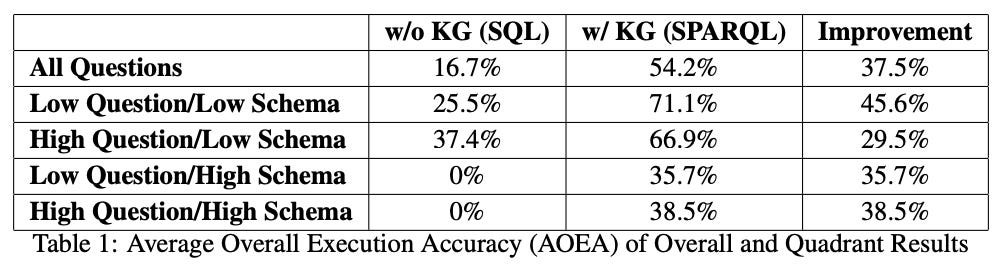 In the paper “A benchmark to understand the role of knowledge graphs on large language models’ accuracy for question answering on enterprise SQL databases”, the author created a robust benchmark series of questions with different levels of complexity using a standardized insurance dataset. They asked ChatGPT to answer the questions in two ways:
