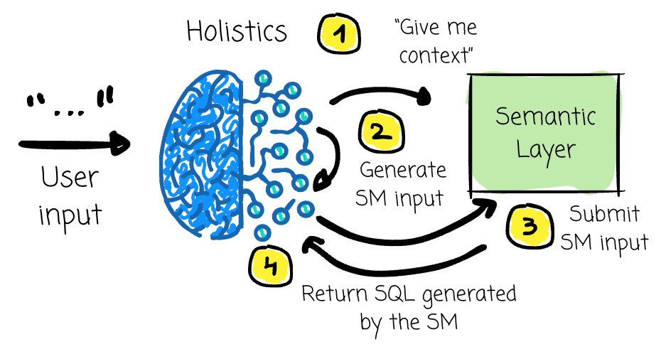 With Holistic’s vision of the semantic layer from the beginning, it would be easier for them to develop the text-to-SQL feature. They’ve tried several approaches, including letting the AI models offload the generation of SQL to the semantic layer by translating the user’s natural language input to a format that the semantic layer could understand, such as a JSON payload.