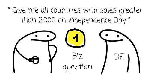 We begin with the business question, the natural language query: for example, all countries with sales greater than 2,000 on Independence Day.