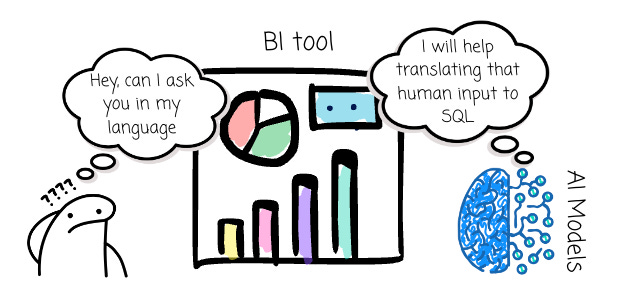 But it seems like that’s not enough. The rise of AI chat interfaces like ChatGPT or Gemini makes people realize that “oh, using natural language is even more productive compared to the visual drag-and-drop.“ BI tools on the market are starting to integrate the ability to answer human questions with the help of AI models.