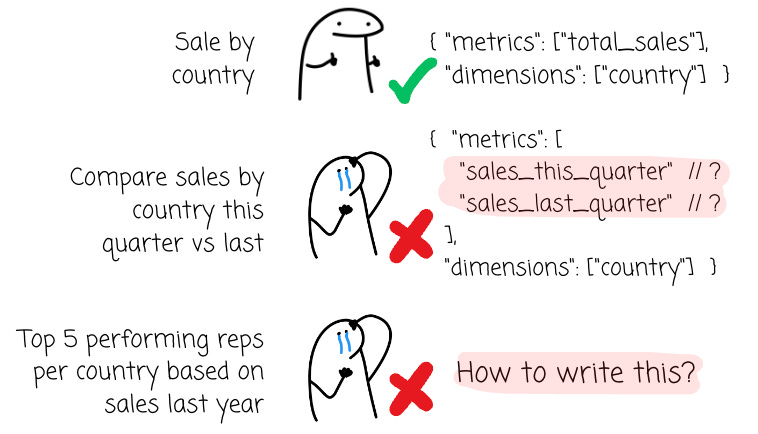 Although relying entirely on the semantic layer could be beneficial, this approach may be limited by the fact that the input format, such as JSON, doesn’t provide users with the necessary flexibility in cases of complex analytics requirements.